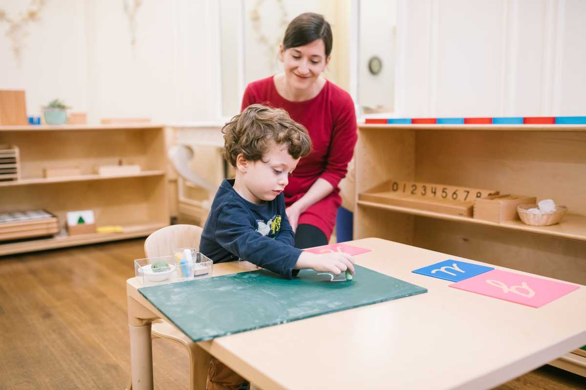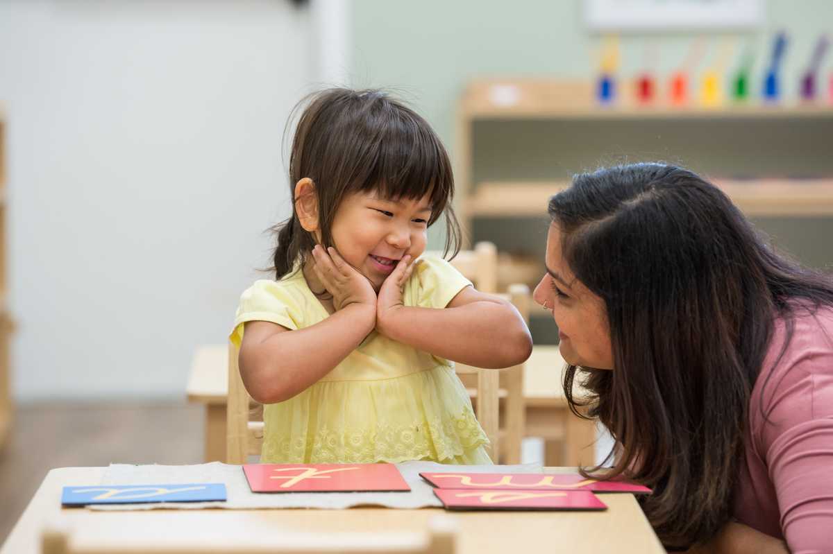 Montessori teachers are referred to as “guides” to describe their role in the classroom more precisely. In a Montessori environment, children actively engage with intentionally-designed materials that help them build knowledge independently. Guides help with this process by providing individual and small group lessons in using the materials, modeling rich vocabulary and classroom expectations, and helping cultivate a supportive community of mixed-age peers.