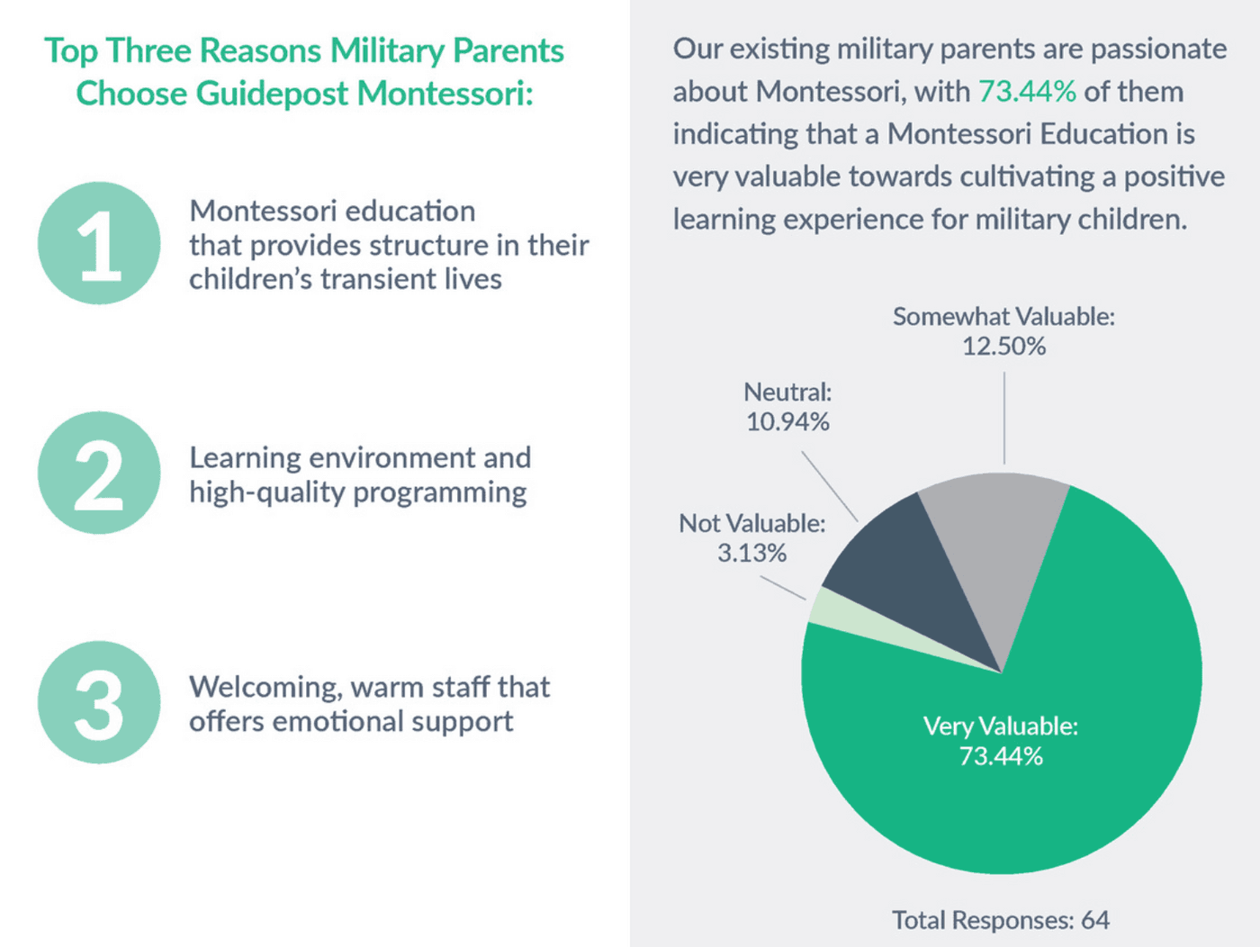 The majority of military families we surveyed report that Montessori is key to a positive learning experience, aligning with core values of independence, resilience and structure. Learning is truly individualized, allowing our guides to meet each child where he or she is — academically, socially and emotionally. Most importantly, when you enroll with a Guidepost, you join more than a school. Our staff is driven by a culture of community that partners intentionally with parents, bridging the child’s journey seamlessly from classroom to home — even if, and especially when, home is transient.